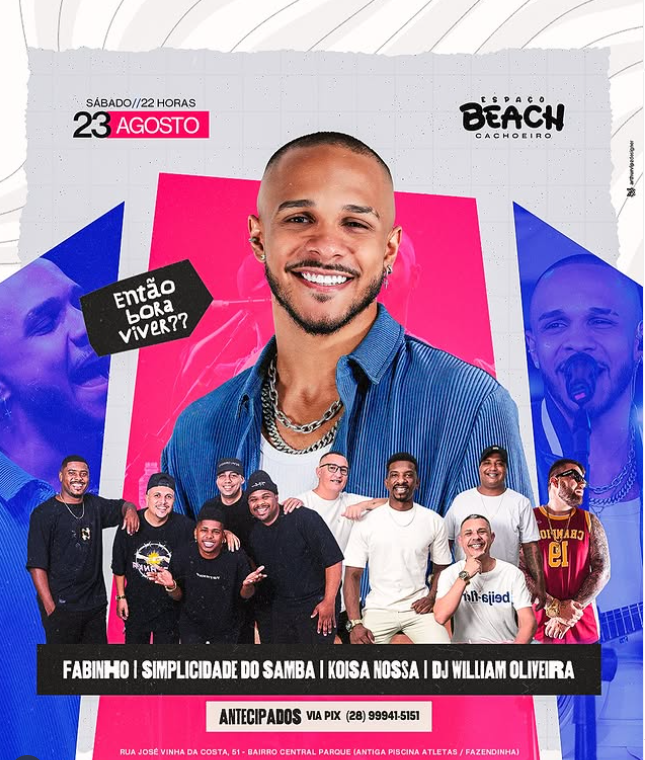 Neste sábado (23), a partir das 22h, o Espaço Beach Cachoeiro se transformará no epicentro da diversão e do samba em Cachoeiro de Itapemirim. O cantor Fabinho, renomado por sua expressiva trajetória no mundo do samba e pagode, será a atração principal da noite, prometendo contagiar a todos com seu carisma e repertório eletrizante.